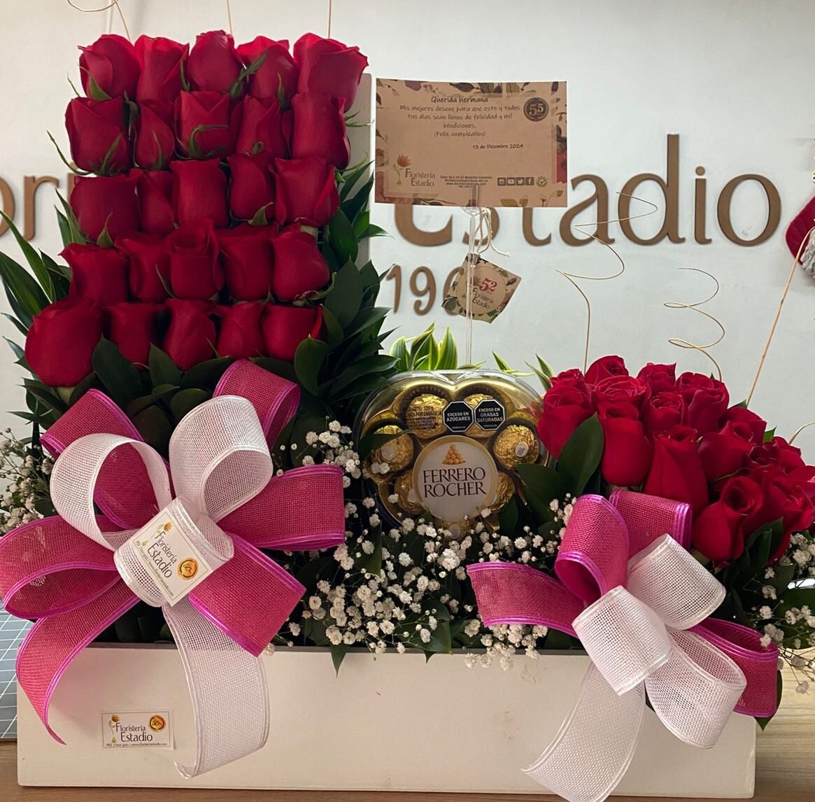 Caja rectangular con 40 a 45 rosas Rosas, Chocolates Ferrero Corazón por 8 unidades