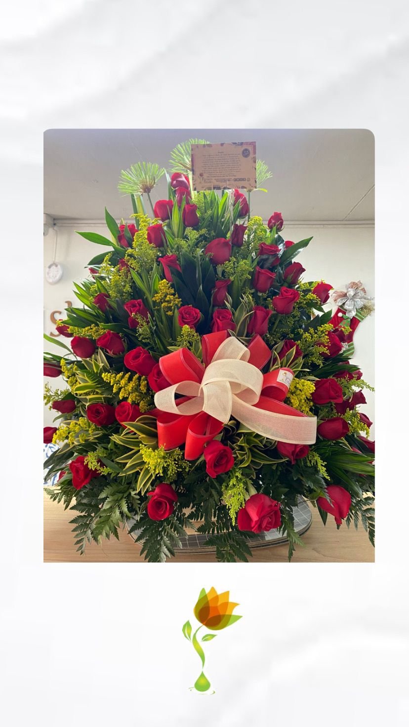 Incluye: Base de madera con entre 50 a 55 rosas, tarjeta