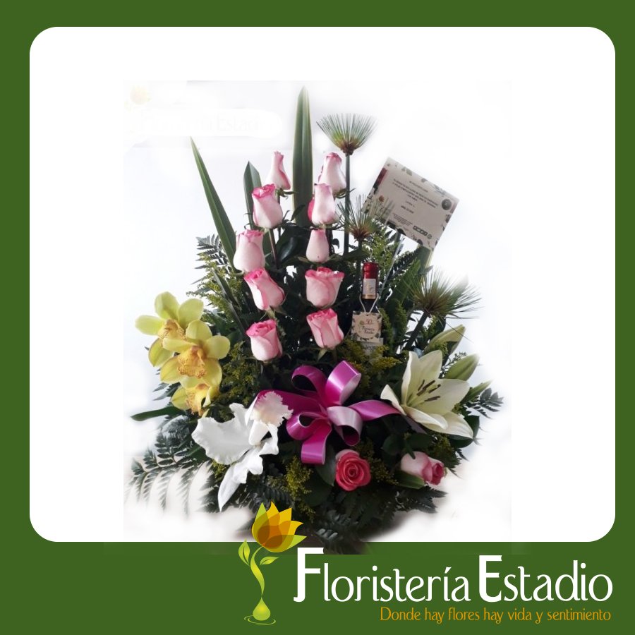 Base Madera con 12 Flores (Rosas- Lirios- Cymbidium), Botella de Vino Tinto