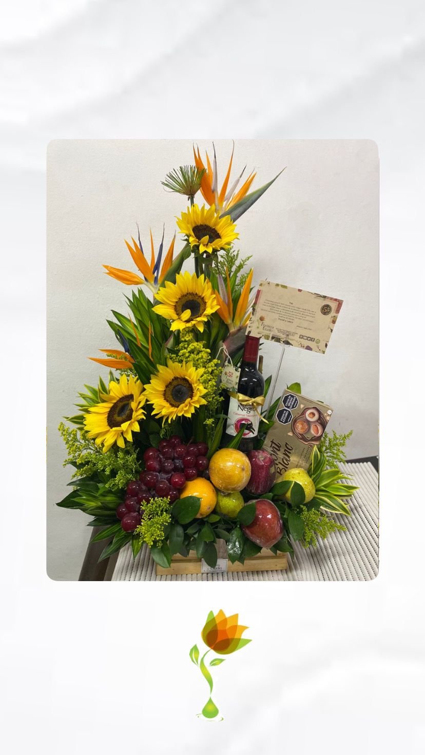 Base de madera, girasoles, exóticas, chocolates mont blac por 7 unidades, frutas y vino tinto
